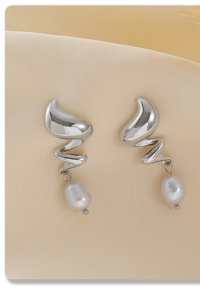 Stainless Steel Spiral Freshwater Pearl Earrings