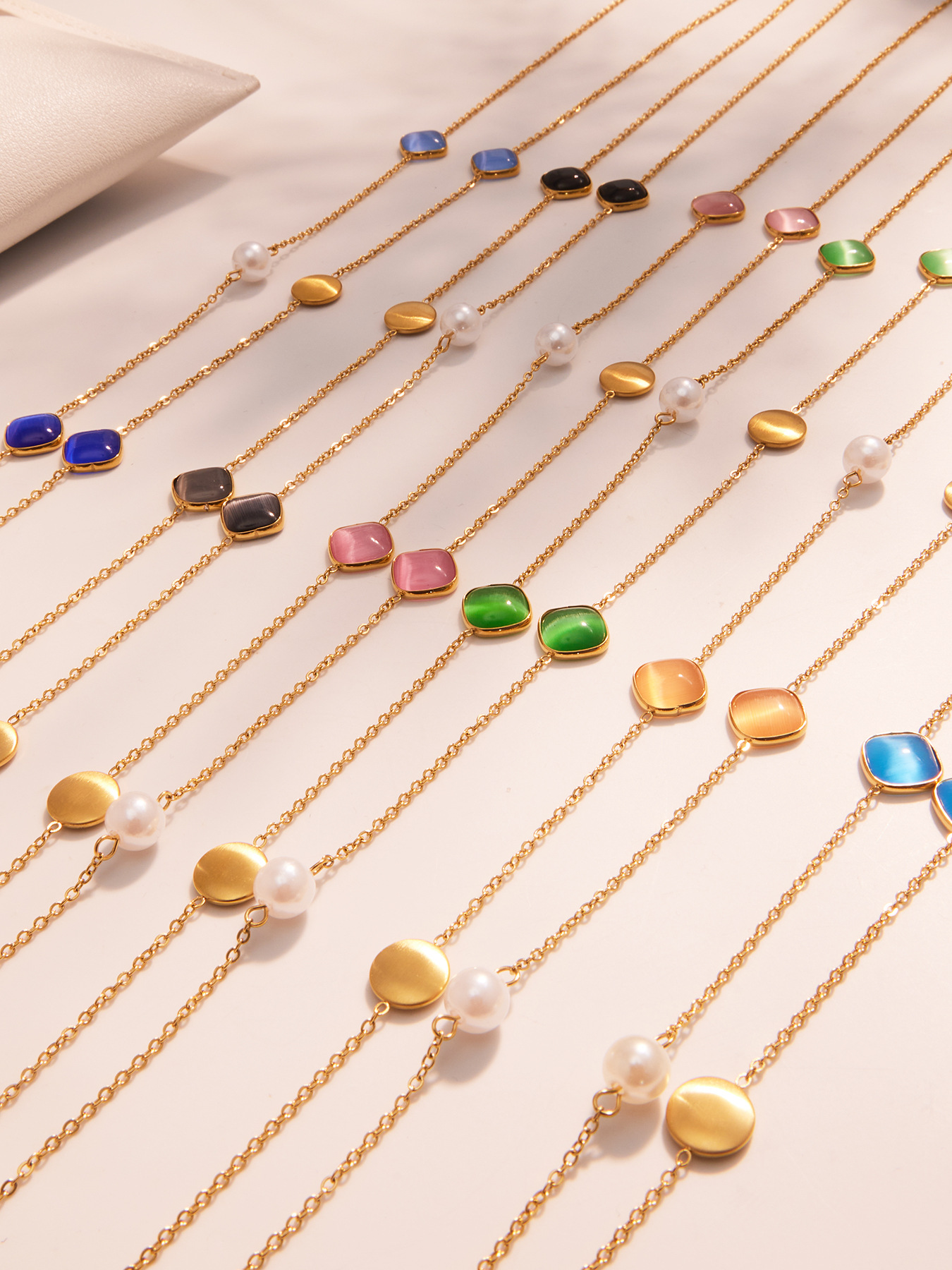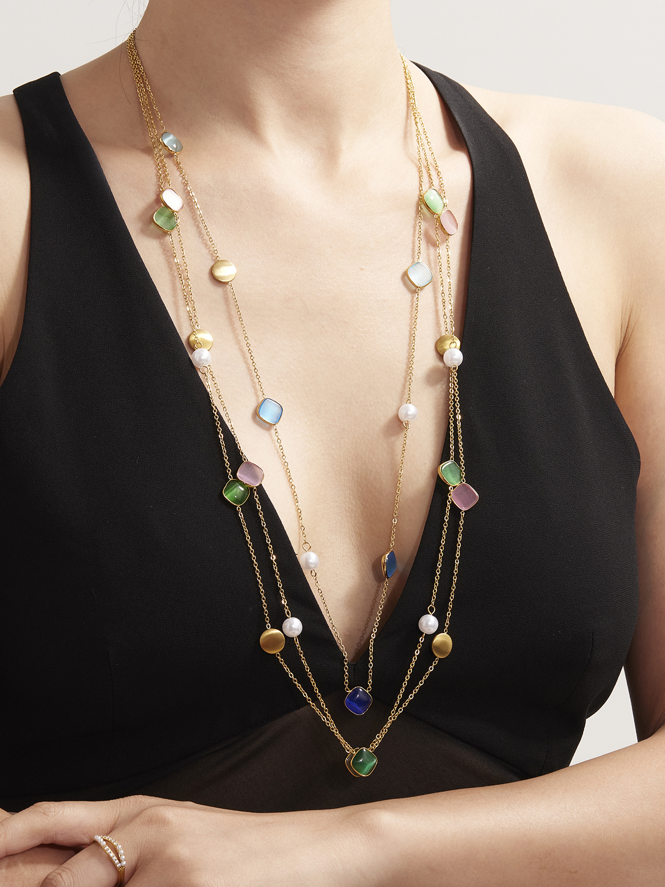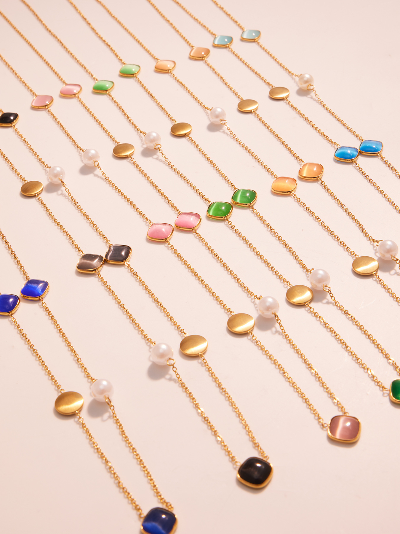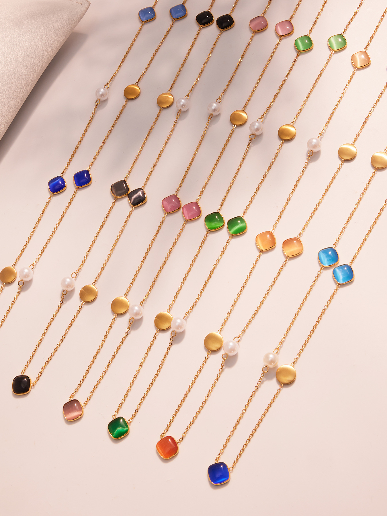 Stainless Steel Candy-Colored Square Cat Eye Stone Long Layering Necklace